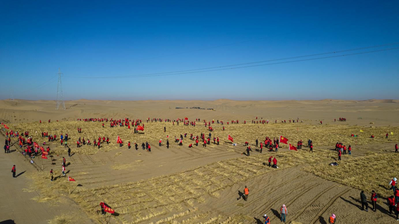 此次义务压沙活动共有凉州区58个单位、3944名干部职工参与。大家在九墩滩光伏治沙示范园区和东北部沙区协同作战,高质量完成1972亩压沙任务,持续筑牢北部沙区生态屏障。