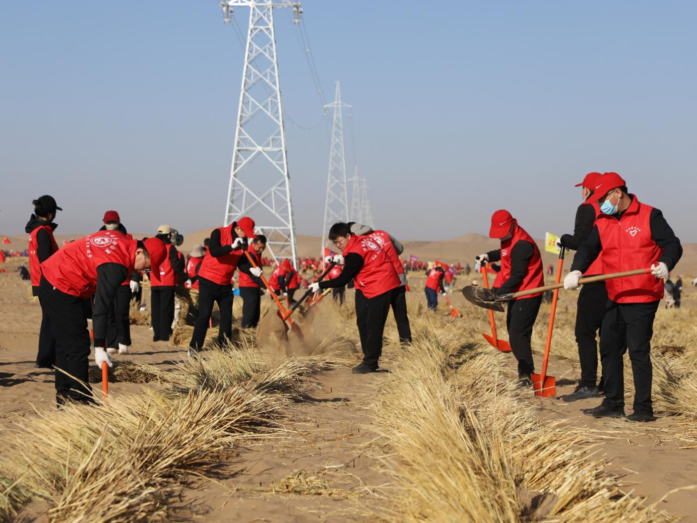 凉州区春季义务压沙现场志愿者们正在挥锹压埋麦草