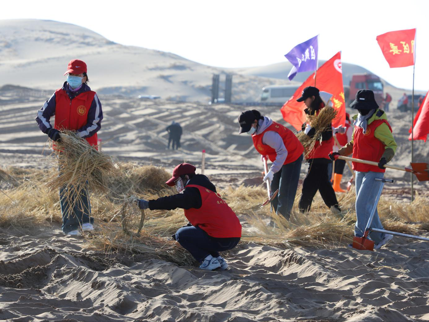 凉州区春季义务压沙现场志愿者正在抱草、俯身铺草