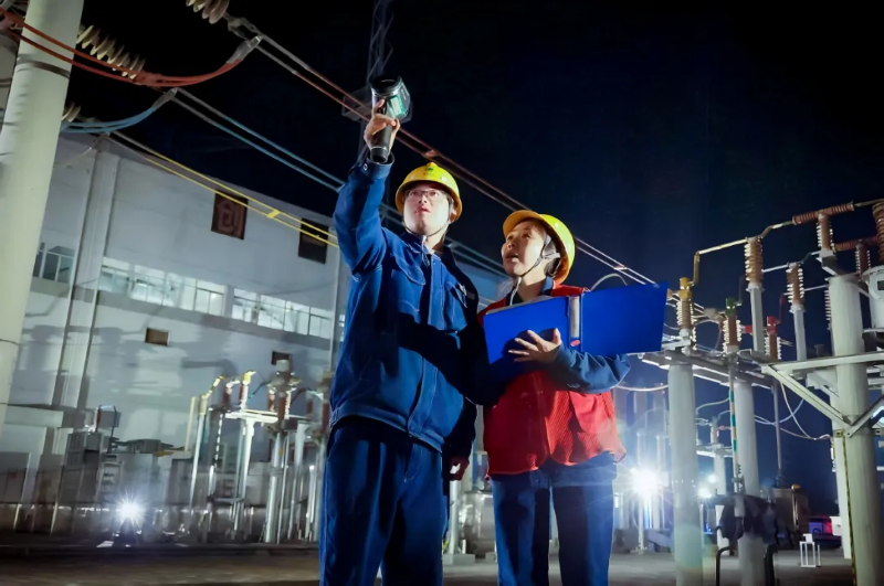 国网天水供电公司运维人员李怀保和金蕾夜间巡视检查电力设备运行状态。李小强 摄