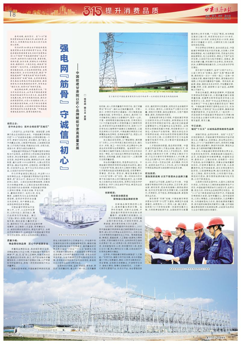 从陇原大地到全国市场,从国内工程到海外项目,从传统电力工程到新能源新质生产力项目,中国能建甘肃院始终以诚信为笔、品质为墨、担当为纸,书写央企品牌的责任与担当。在“3·15”这个彰显诚信与品质的节点,中国能建甘肃院再次承诺:坚守质量初心,恪守诚信底线,以匠心铸精品,以担当践使命,以品牌赢未来,为构建新型电力系统、推动能源高质量发展、服务国家战略落地贡献更大力量,让中国能建品牌在陇原大地熠熠生辉,让诚信与品质成为企业行稳致远的永恒基石。