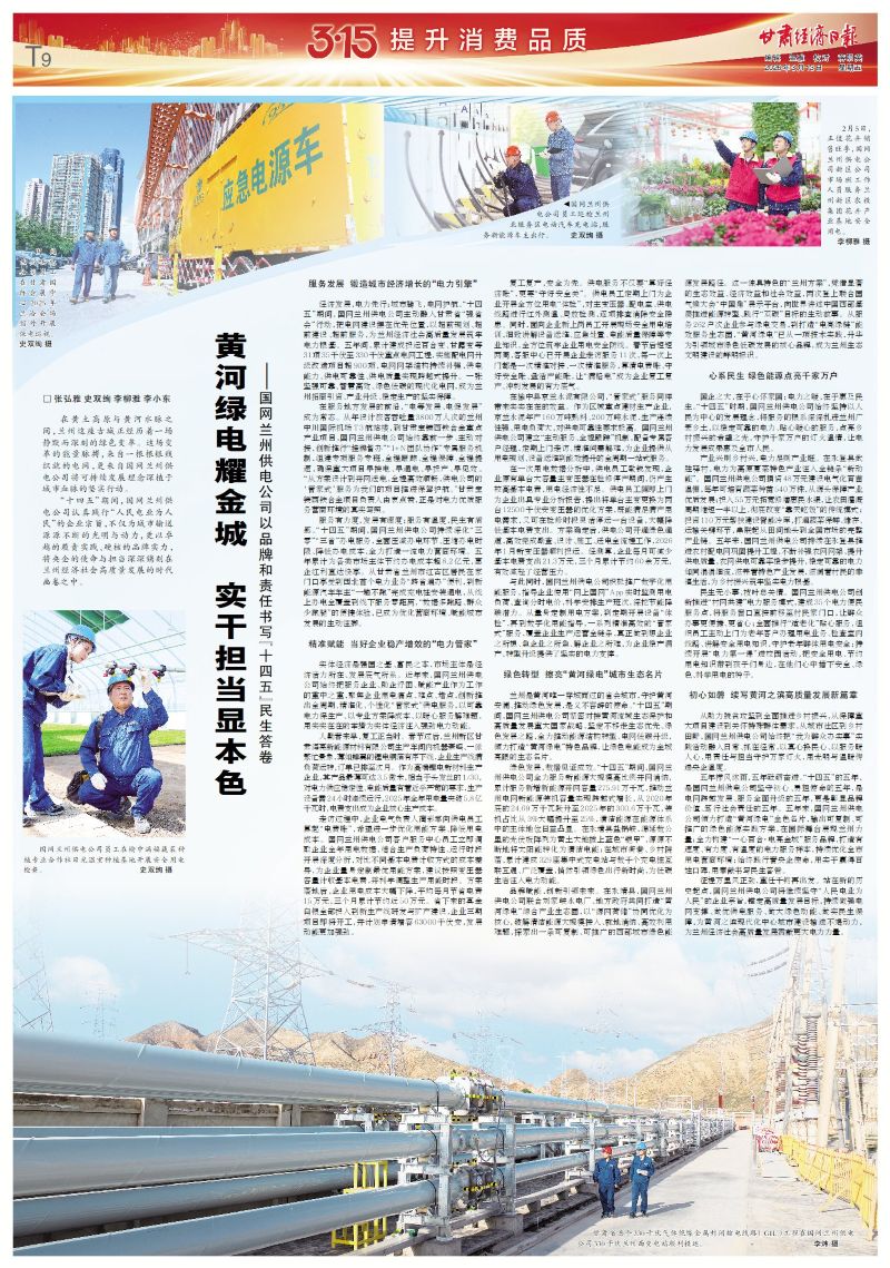 兰州是黄河唯一穿城而过的省会城市,守护黄河安澜、推动绿色发展,是义不容辞的使命。“十四五”期间,国网兰州供电公司紧密对接黄河流域生态保护和高质量发展重大国家战略,坚定不移走生态优先、绿色发展之路,全力推动能源结构转型、电网低碳升级,倾力打造“黄河绿电”特色品牌,让绿色电能成为金城亮眼的生态名片。