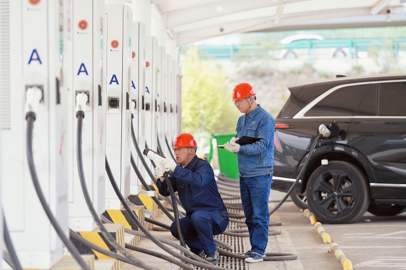 国网兰州供电公司员工巡检兰州北服务区电动汽车充电站,服务新能源车主出行。史双绚 摄