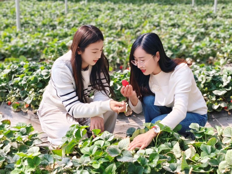暖意融融的空气里弥漫着清甜的果香,一垄垄翠绿的草莓苗整齐排列,绿叶间缀满了一颗颗鲜红饱满、娇艳欲滴的果实。游客们提着篮子,穿梭其间,笑语盈盈,享受着采摘之乐。