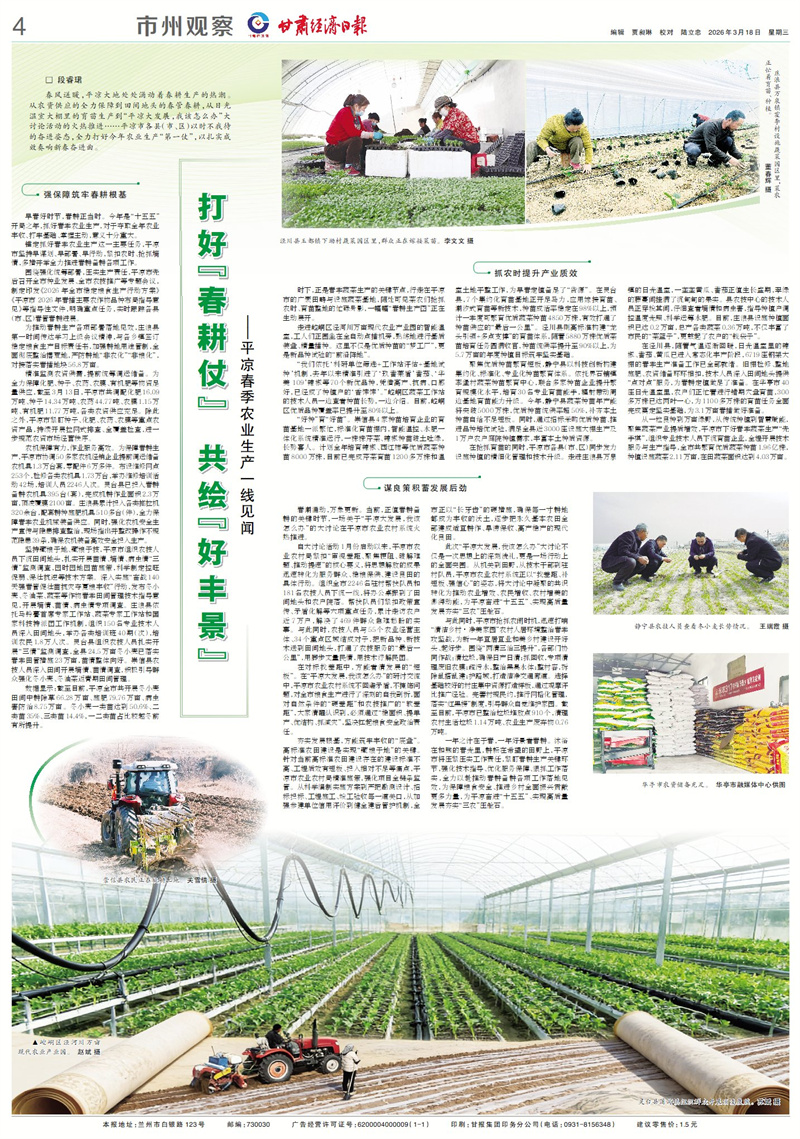 一年之计在于春,一年好景看春耕。沐浴在和煦的春光里,耕耘在希望的田野上,平凉市将压紧压实工作责任,紧盯春耕生产关键环节,强化技术指导、优化服务保障、狠抓工作落实,全力以赴推动春耕备耕各项工作落地见效,为保障粮食安全、推进乡村全面振兴贡献更多力量,为平凉奋进“十五五”、实现高质量发展夯实“三农”压舱石。