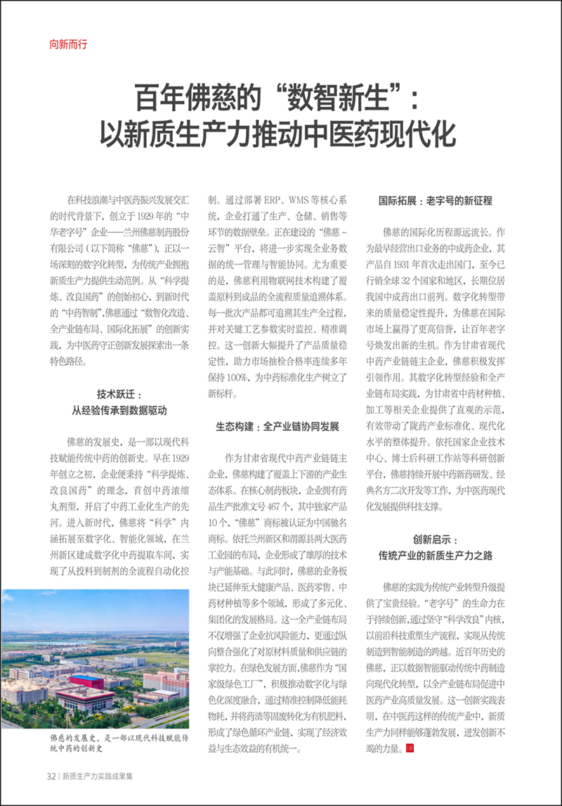 春风浩荡,万物竞发。近日,从北京传来喜讯:兰州佛慈制药股份有限公司(以下简称“佛慈”)的创新实践成果《百年佛慈的“数智新生”:以新质生产力推动中医药现代化》一文,凭借其厚重的历史积淀与务实的科技创新实践,成功入选国家级刊物《瞭望》两会特刊《向新而行——新质生产力实践成果集》。