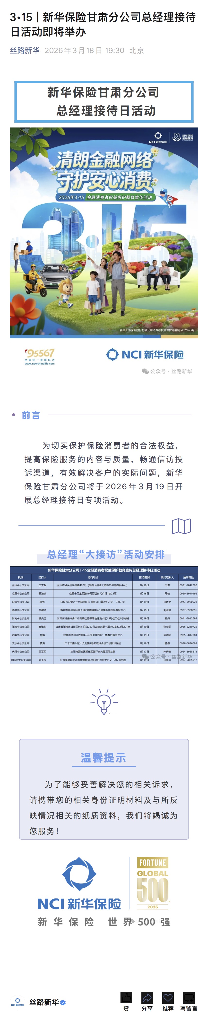 3·15|新华保险甘肃分公司总经理接待日活动即将举办
