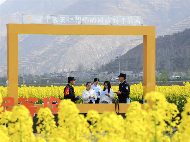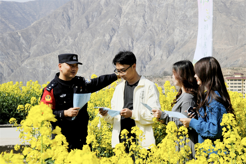 列车抵达陇南站,驻站民警提前到岗,在出站口设立服务台,发放景区服务卡,并联合地方交管、公交部门开辟赏花专线通道,维持接驳秩序,助力游客快速换乘。在油菜花田,民警化身“护花使者”,沿田埂巡逻值守,做好安全提醒与路线引导。
