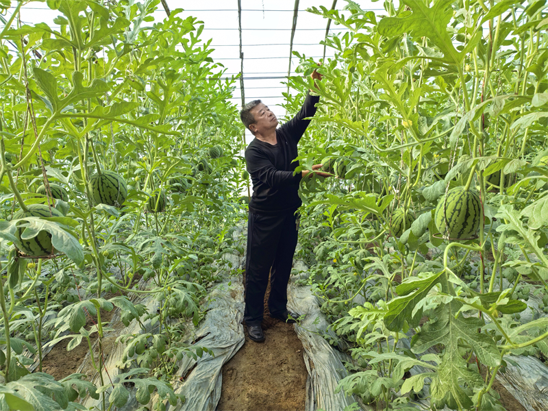 3月23日,武威市凉州区发放镇小路村村民李庆金正蹲在自家温室大棚里整理瓜秧。棚内藤蔓繁茂,青嫩的109白皮西瓜长势喜人。“一株苗只留一个瓜,这样品质才能达标。”李庆金笑着说,这是今年的头茬瓜,新品种皮薄、甜度高,“五一”前后即可上市,订单直发北上广,一公斤能卖8.4元,两个棚预计收入2万元。