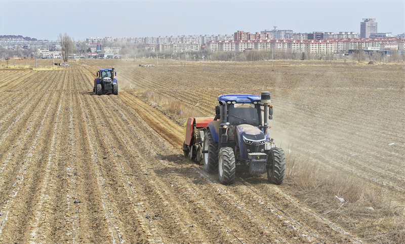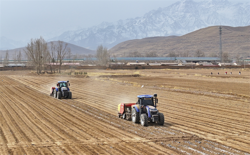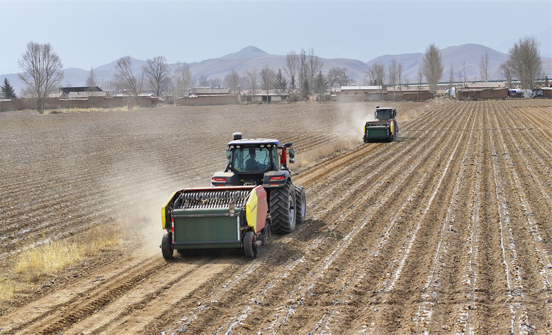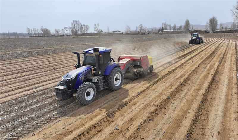 2026年3月26日,在民乐县洪水镇上柴村,残膜回收和秸秆还田一体机正在开展残膜回收和根茬还田作业。