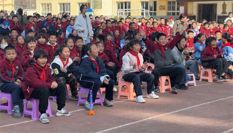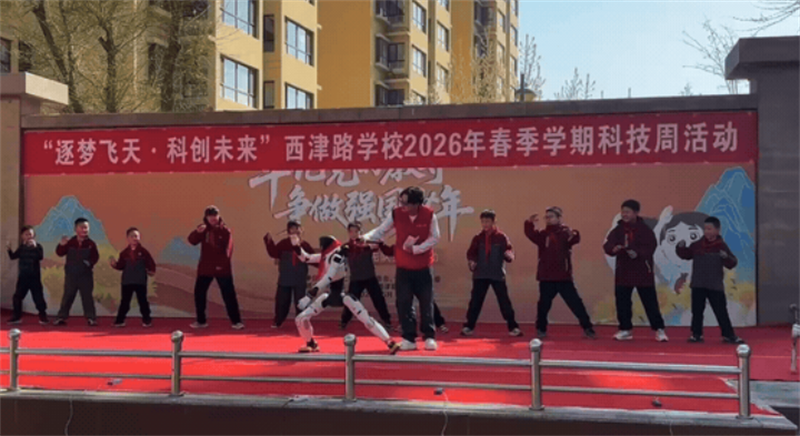 活动在该学校操场拉开帷幕,现场气氛热烈。人形机器人与两只机器狗一经亮相,便引发孩子们阵阵欢呼。舞台上,人形机器人灵活地展示街舞、太极等动作,还与同学们互动提问,部分学生代表为机器人佩戴红领巾表达欢迎,整个操场洋溢着欢声笑语,科技的吸引力在互动中悄然传递。
