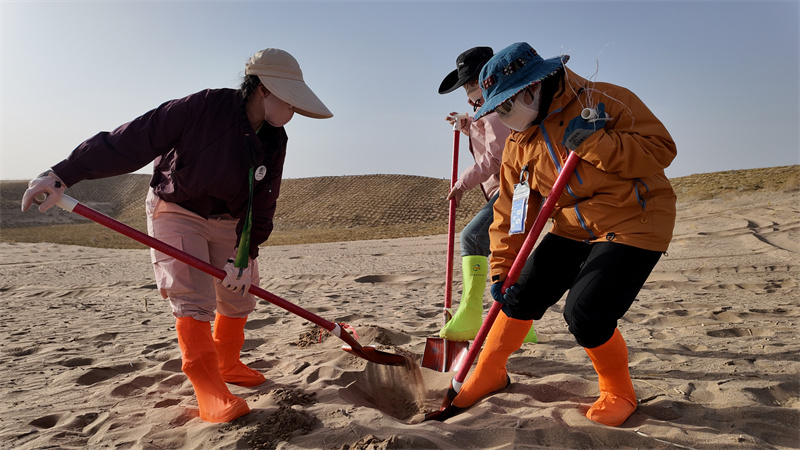 专程从泰国飞来的刘柯君,带着家人一同躬身植绿。她指尖沾满沙土,一边小心翼翼地为梭梭苗培土,一边感慨:“这么多人从各地赶来做同一件事情,这份守护绿洲的执着,让我特别震撼。”