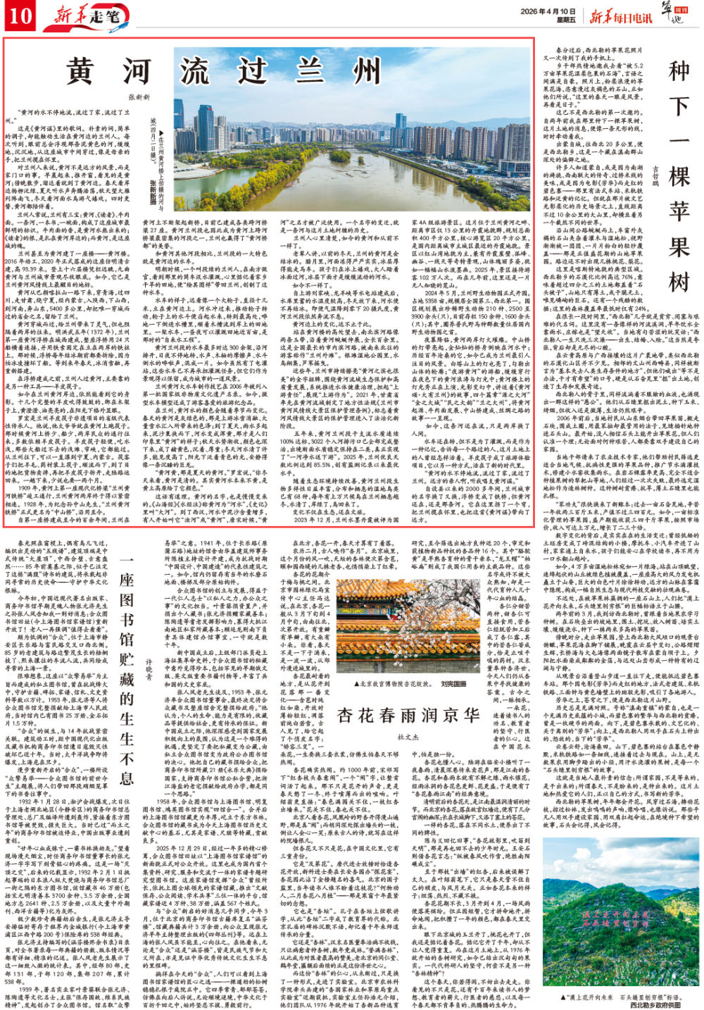 对兰州人来说,黄河不是远方的风景,而是家门口的事。早晨起来,推开窗,看见的是黄河;傍晚散步,溜达着就到了黄河边。春天看岸边杨柳泛绿,夏天听水声奔腾浩荡,秋天望大雁列阵南飞,冬天看河面水鸟游弋嬉戏。四时更替,黄河都陪伴着。