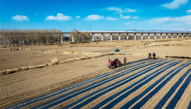 4月4日,天祝县华藏寺镇周家窑村高原夏菜正式开播,春播的“铁牛”和高速列车形成新时代的春耕生产图景。新甘肃·甘肃经济日报通讯员 赵世鹏 摄