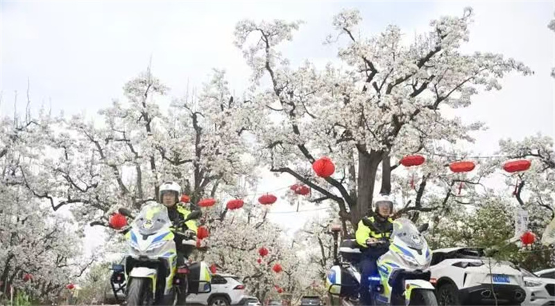 一阵风吹过,万树梨花如雪般飘落。在花雨纷飞中,民警们忙碌的身影与满园春色融为一体。他们用严密的防线和暖心的服务,守护着每一位游客的平安,让这份春日限定的美景得以安全、有序、顺畅地绽放。