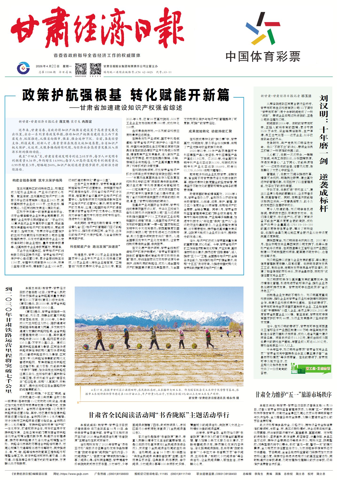 如今,知识产权已成为甘肃高质量发展的重要支撑、核心动能。今年,甘肃省知识产权工作将继续聚焦优化环境、产业发展、高标准市场体系建设,持续运用“四张清单”,深入推进“五个一”工程,全面提升知识产权全链条综合能力,加快推动知识产权强省建设,实现“十五五”良好开局,为推进中国式现代化甘肃实践贡献更多知识产权力量。